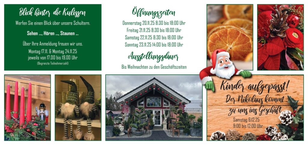 22./23. Dezember 8:30 - 18:00 | 24./ 27. Dezember 8:30 - 12:30 | 29./30. Dezember 8 :30 - 18:00 | 31. Dezember 8 :30 - 12:30